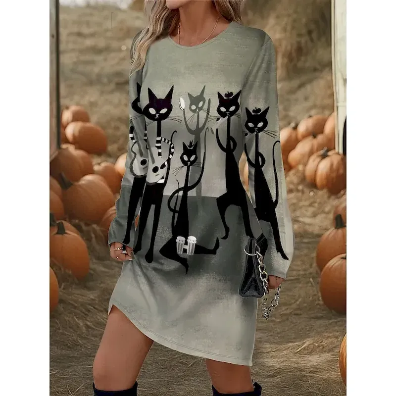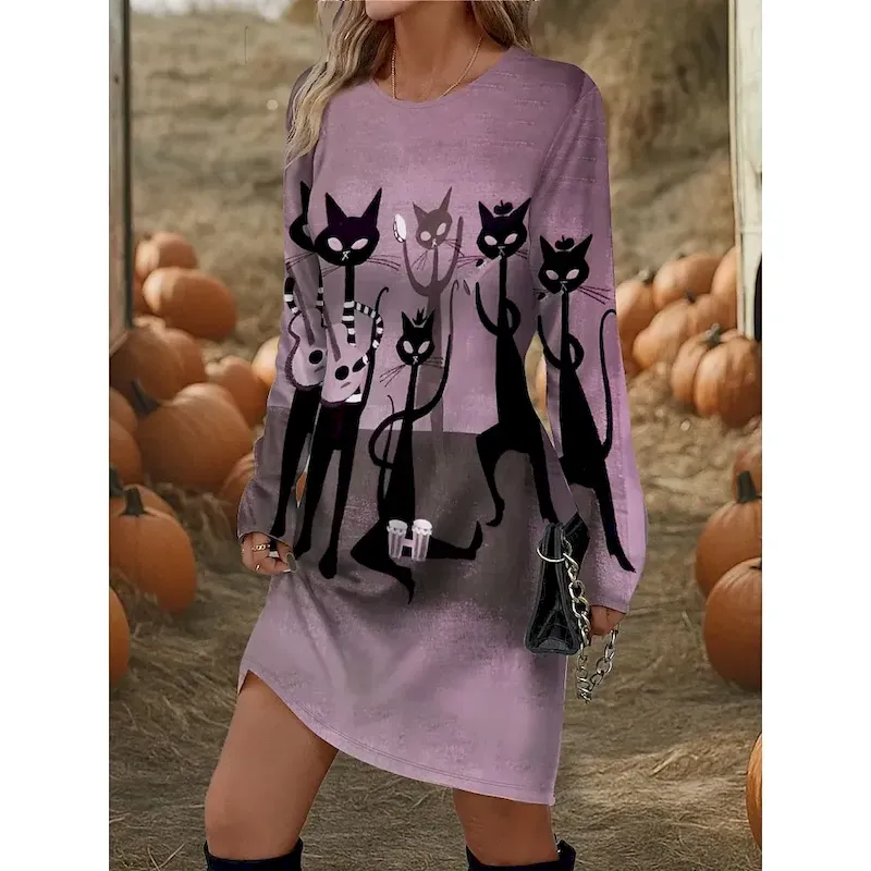 Halloween Women’s Black Cat Print Mini Dress T Shirt Dress Tee Dress Shift Dress Dress Vacation Casual Party Daily Regular Fit Graphic Long Sleeve Crew Neck Purple Fuchsia Green Spring Fall Winter