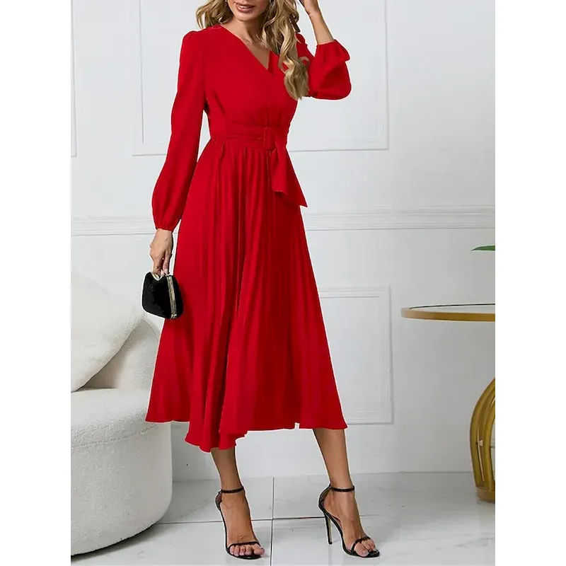 Women’s Casual Dress Midi Dress Ruched With Belt Work Elegant V Neck Long Sleeve Black Red Blue Color