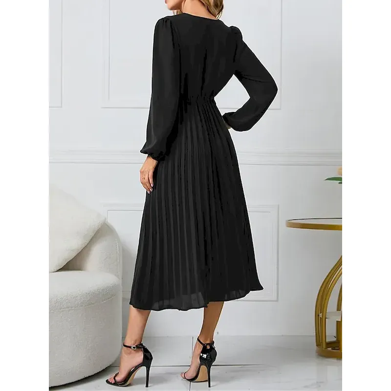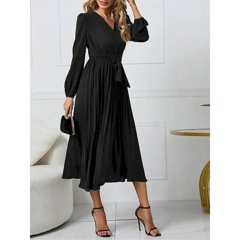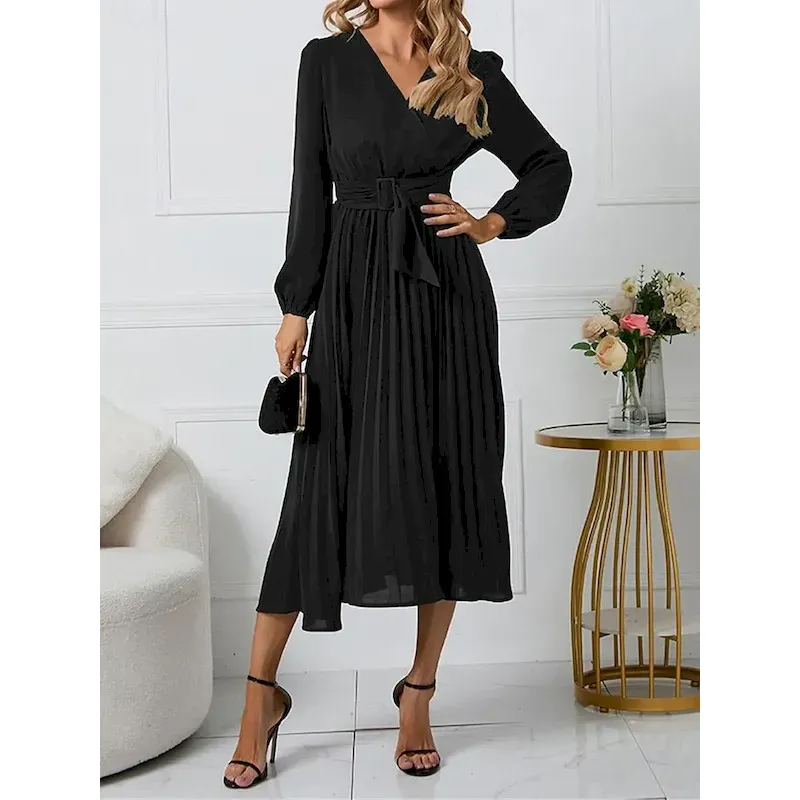 [Design Highlights]: The dress features a sophisticated V-neckline and long sleeves, contributing to its elegant style. The ruched detailing and belted waist add an element of modernity, while the pleated skirt enhances its classic and feminine charm. Available in versatile colors—blue, green, black, and red—this piece effortlessly combines timeless appeal with contemporary flair.