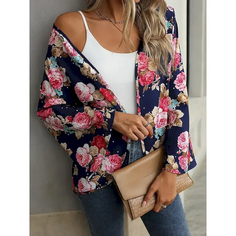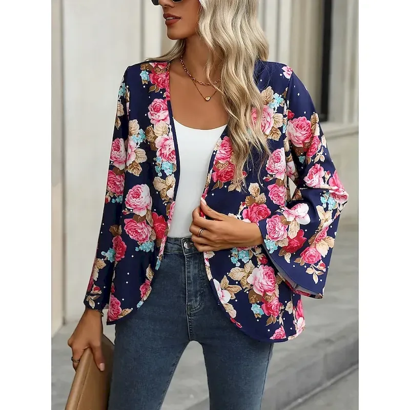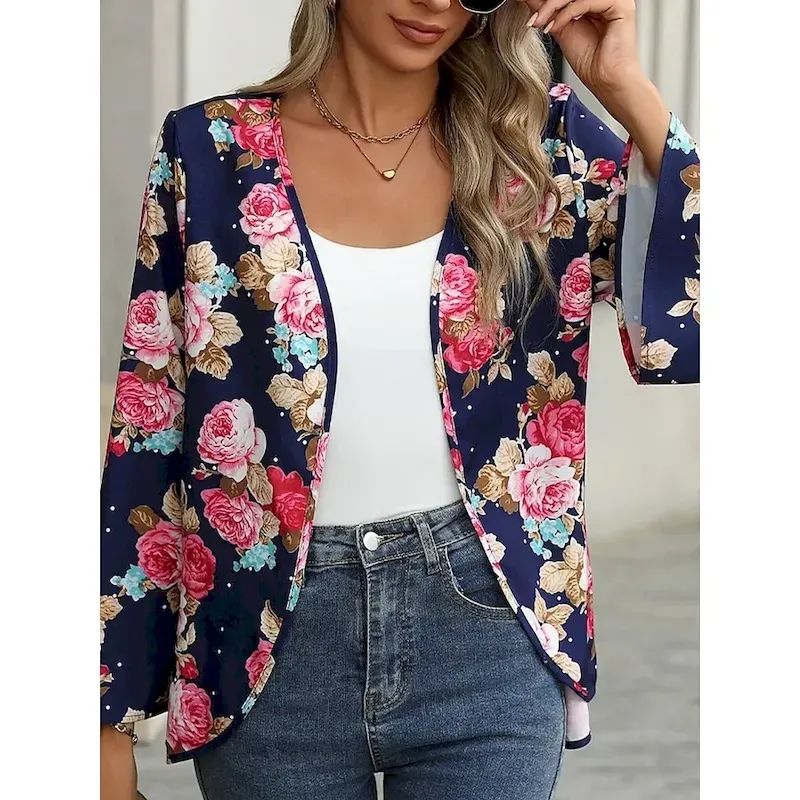 Women’s Casual Jacket Comfortable Breathable Print Casual Floral Vacation Street Casual Daily Wear Open Front Short Collarless Regular Fit Long Sleeve Outerwear Navy Summer Spring