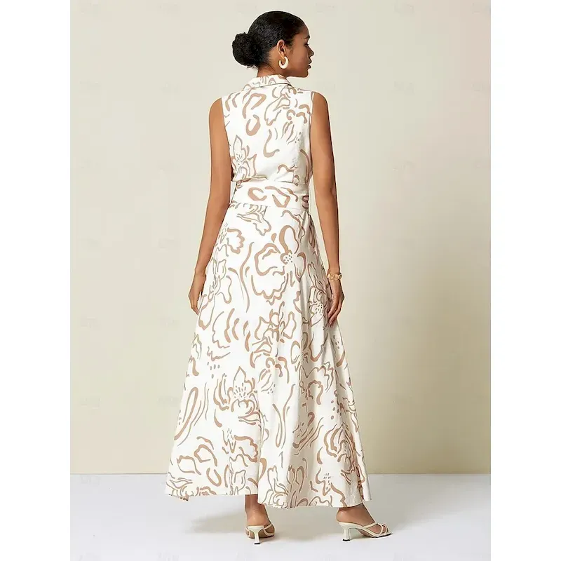 Women’s Sleeveless Maxi Shirt Dress Summer A Line Shirt Collar With Belt Curve Pocket Linen Look Fabric Waist Slim Fit Blue Green Beige
