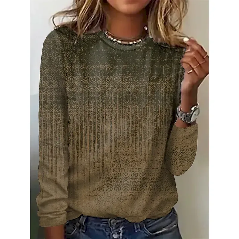 [Fabric & Material] Crafted from high-quality polyester, this women’s T-shirt offers a micro-elastic feel that ensures comfort and breathability, perfect for the cooler seasons of fall and winter. The fabric is lightweight, providing ease of wear throughout the day whether it’s chilly or mild. [Fit & Style] Designed with a regular, relaxed fit, this T-shirt delivers an effortlessly chic look. The long sleeves and classic round neck design make it a versatile piece that pairs easily with jeans or skirts for both casual and semi-formal outings. Its comfortable fit accommodates a range of body types, adding to its appeal as a basic wardrobe staple.[Design Highlights] The T-shirt features a beautiful graphic print that transitions in a gradient pattern from navy blue at the top to a lighter blue at the bottom, reminiscent of lace or filigree designs, adding an elegant and sophisticated touch. The sleeves are slightly gathered at the wrists, enhancing its stylish and laid-back aesthetic.[Occasions] Perfect for daily wear and weekend outings, this T-shirt caters to various scenarios, whether you’re heading out for a relaxed coffee catch-up or attending a casual evening event. Its versatile design ensures you look trendy and well-dressed for any daily or semi-casual occasion.[Size Range] Available in a range of sizes from S to 2XL, this T-shirt accommodates a variety of fits, ensuring that you find the perfect size for your body type and style preference.OK