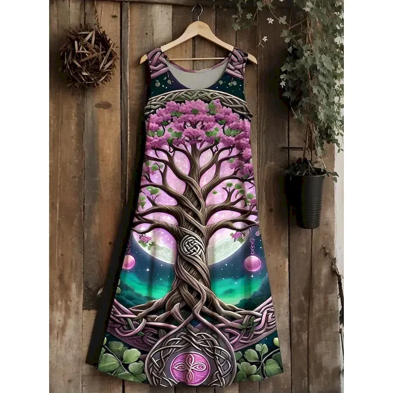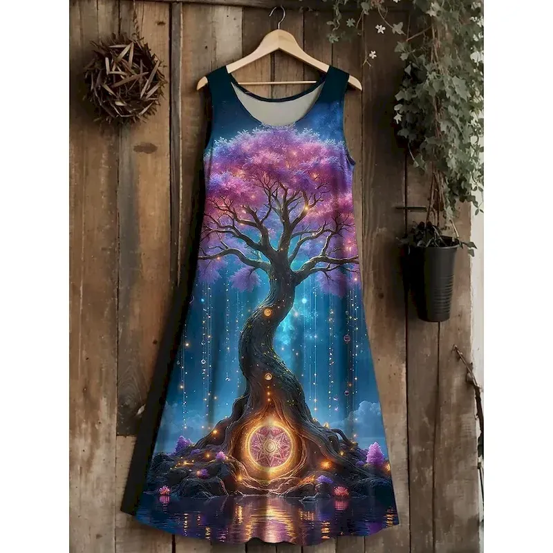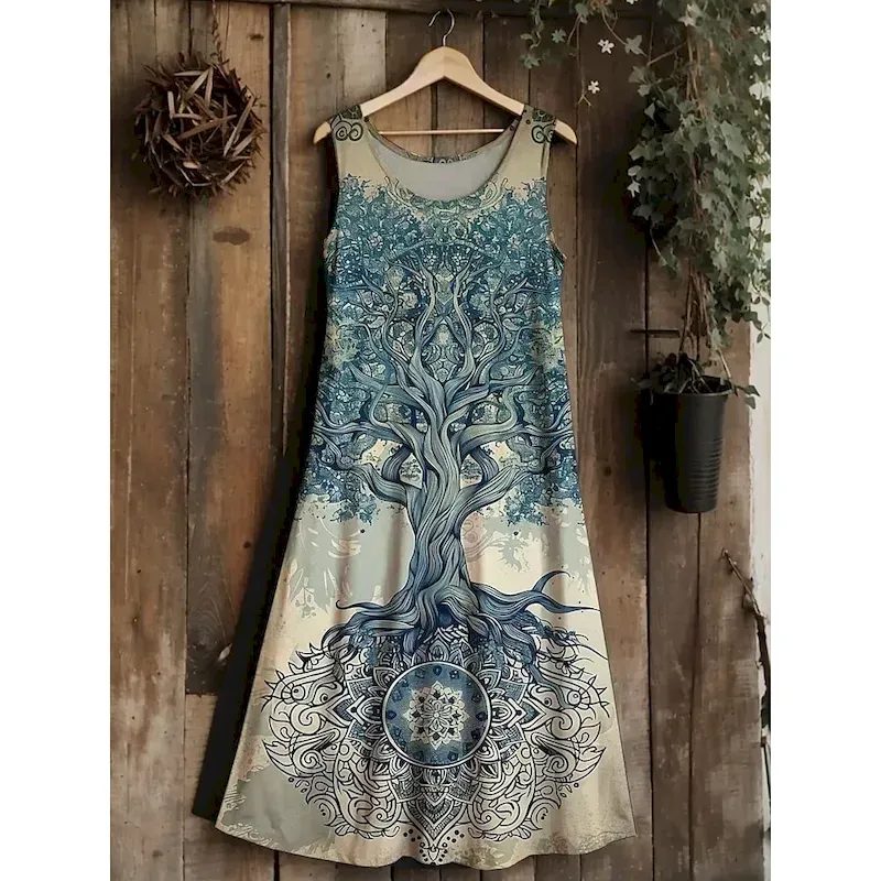 Women’s Tree of Life Merkabah Midi Dress Sundress A Line Dress Vacation Casual Boho Wedding Party Going out Standard Fit Floral Graphic Leaf Sleeveless U Neck Blue Dark Green Purple Green Summer